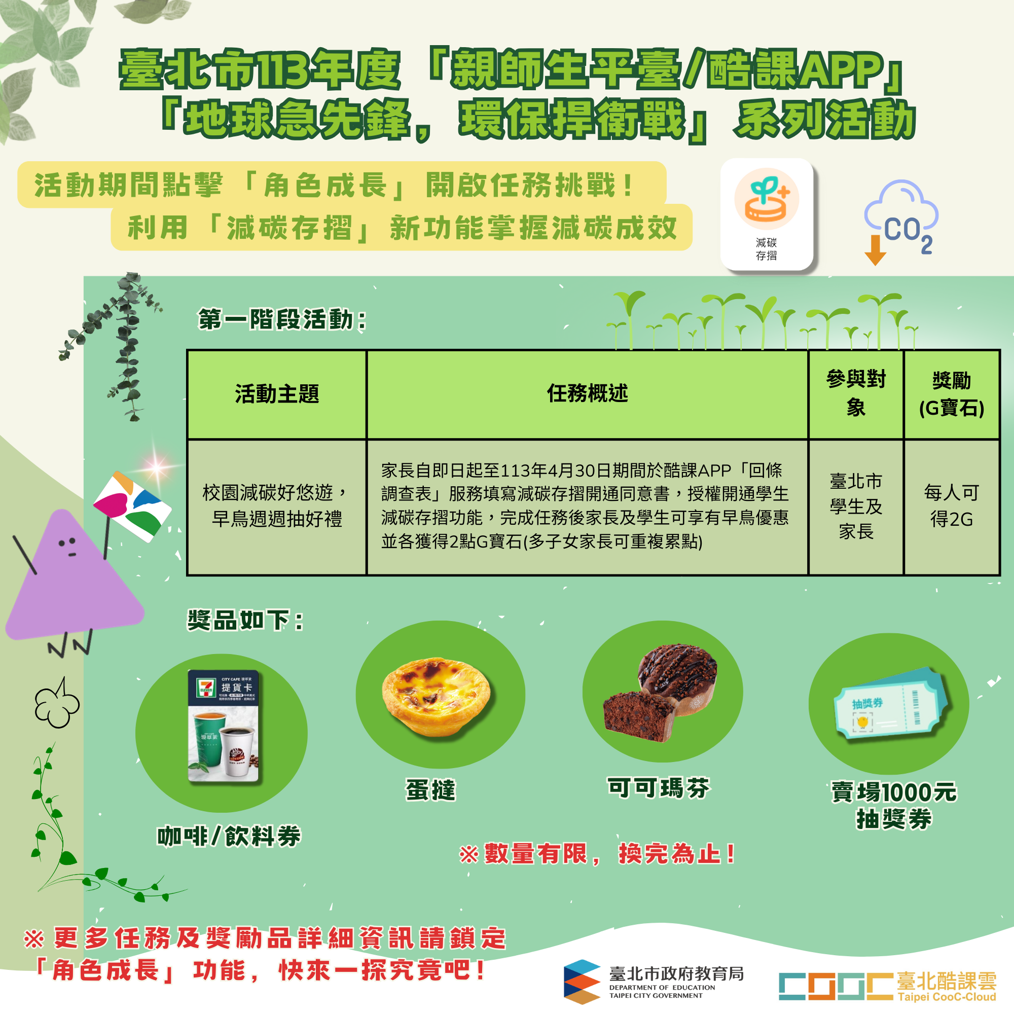 一、為響應2025淨零碳排目標,培養學生環境保育觀念,113年4月於「親師生平臺/酷課APP」推出學生「減碳存摺」功能,並結合酷課APP「角色成長」獎勵制度,推出「地球急先鋒,環保捍衛戰」系列活動計畫。