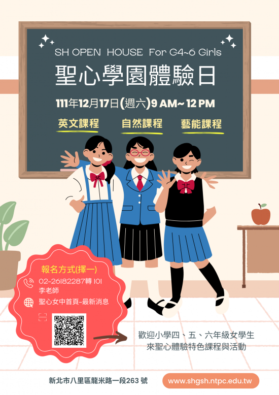一、日期:111年12月17日(週六)上午8:30~12:10。 二、對象:小學四、五、六年級女學生 三、報名網址:https://docs.google.com/forms/d/e/1FAIpQLSe3AZ02-Vd8_vczmSviJZ6UMcdTw2wilbgWW-4D1sKtOiVCGQ/viewform?usp=sf_link (點我進入) 四、聯絡人:李雪琴老師(02-26182287轉101)