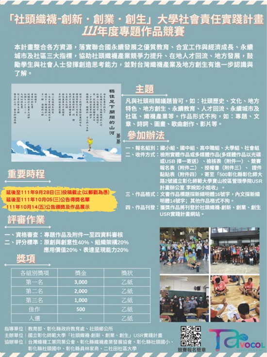 四、競賽承辦人:國立彰化師範大學「社頭織襪-創新、創業、創生」USR計畫辦公室 李婉如小姐,連絡電話:(04)7232105分機7015。