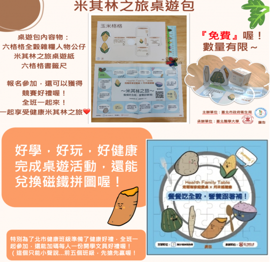 一、為提升學生族群「全穀及未精製雜糧」識能並增加其攝取量,衛生局於111年委託臺北醫學大學(以下稱該校)辦理旨揭活動(活動圖卡如附件),並運用衛生福利部國民健康署與營養師的專業知識,製作「米其林之旅」桌遊模組,透過寓教於樂方式提升學童對於「全穀及未精製雜糧」認識並主動增加其攝取。 二、相關活動訊息請逕洽活動承辦單位臺北醫學大學陸小姐02-2736-1661分機2674。