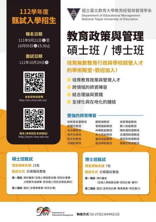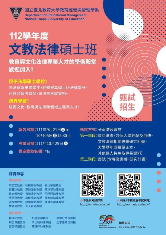 一、國北教大112學年度教育經營與管理學系碩博士班甄試(包括教 育政策與管理碩士班、博士班、文教法律碩士班)之招生名 額、報考資格、甄試時間、項目及備審資料等規定如附件。