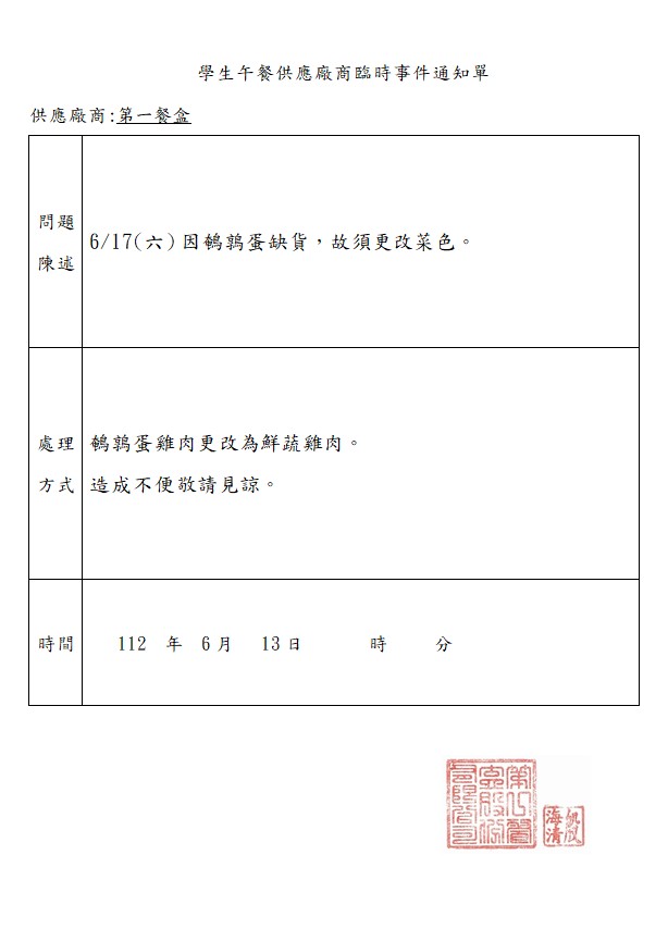 鵪鶉蛋雞肉改為鮮蔬雞肉。