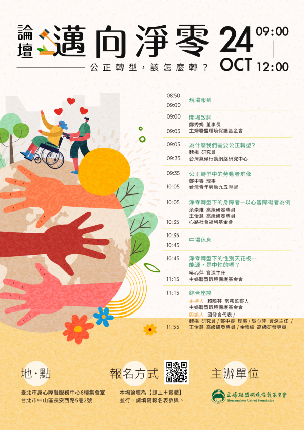 一、財團法人主婦聯盟環境保護基金會為提倡淨零轉型不遺落任何人之理念,倡議公正轉型之重要性,辦理旨揭論壇,資訊如下: (一)日期:112年10月24日(星期二) (二)地點:本市身心障礙服務中心6樓集會室(本市中山區長安西路5巷2號) (三)議題: 1、為什麼我們需要公正轉型? 2、公正轉型中的勞動者群像 3、淨零轉型下的身障者—以心智障礙者為例 4、淨零轉型下的性別天花板—能源,是中性的嗎?