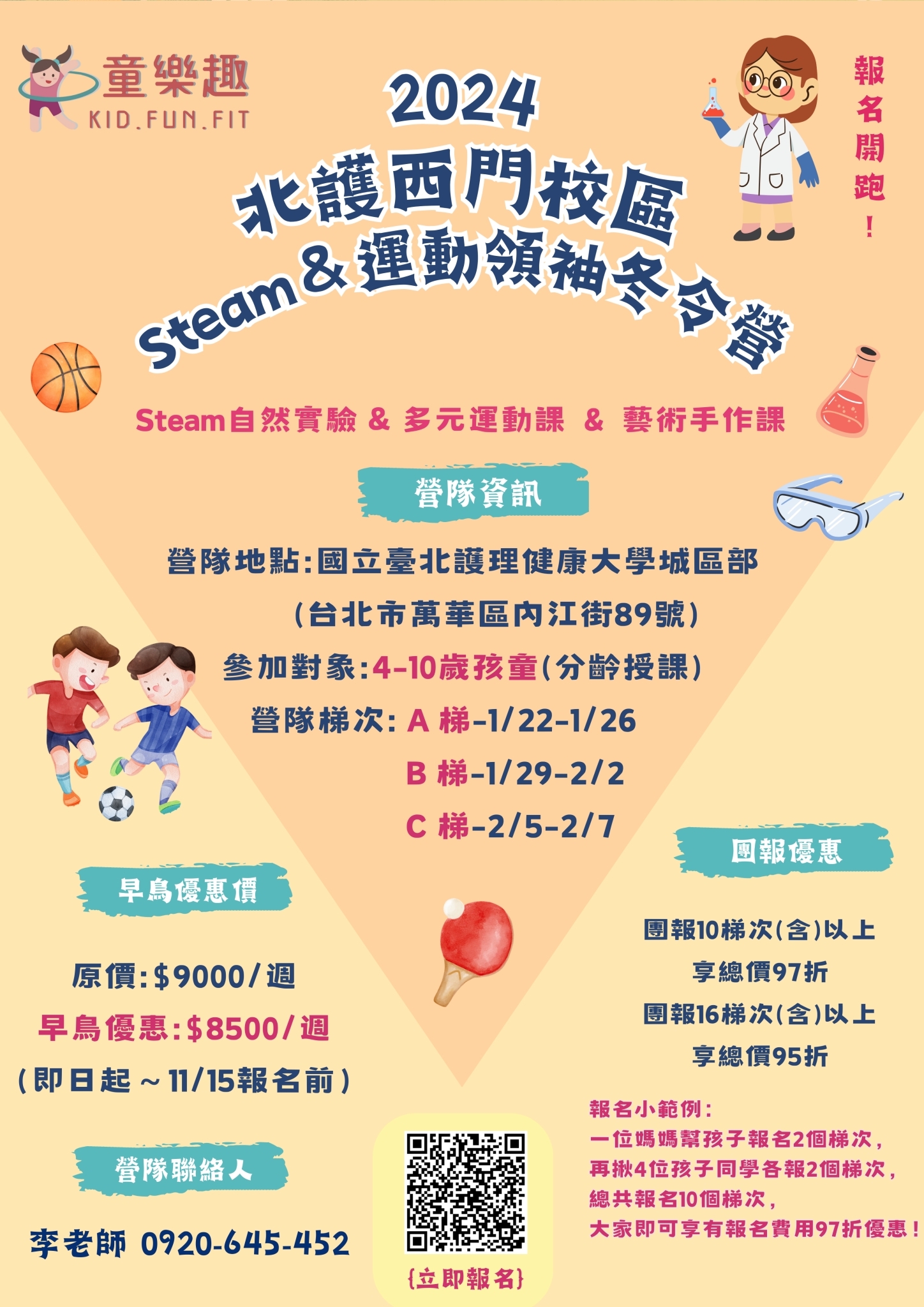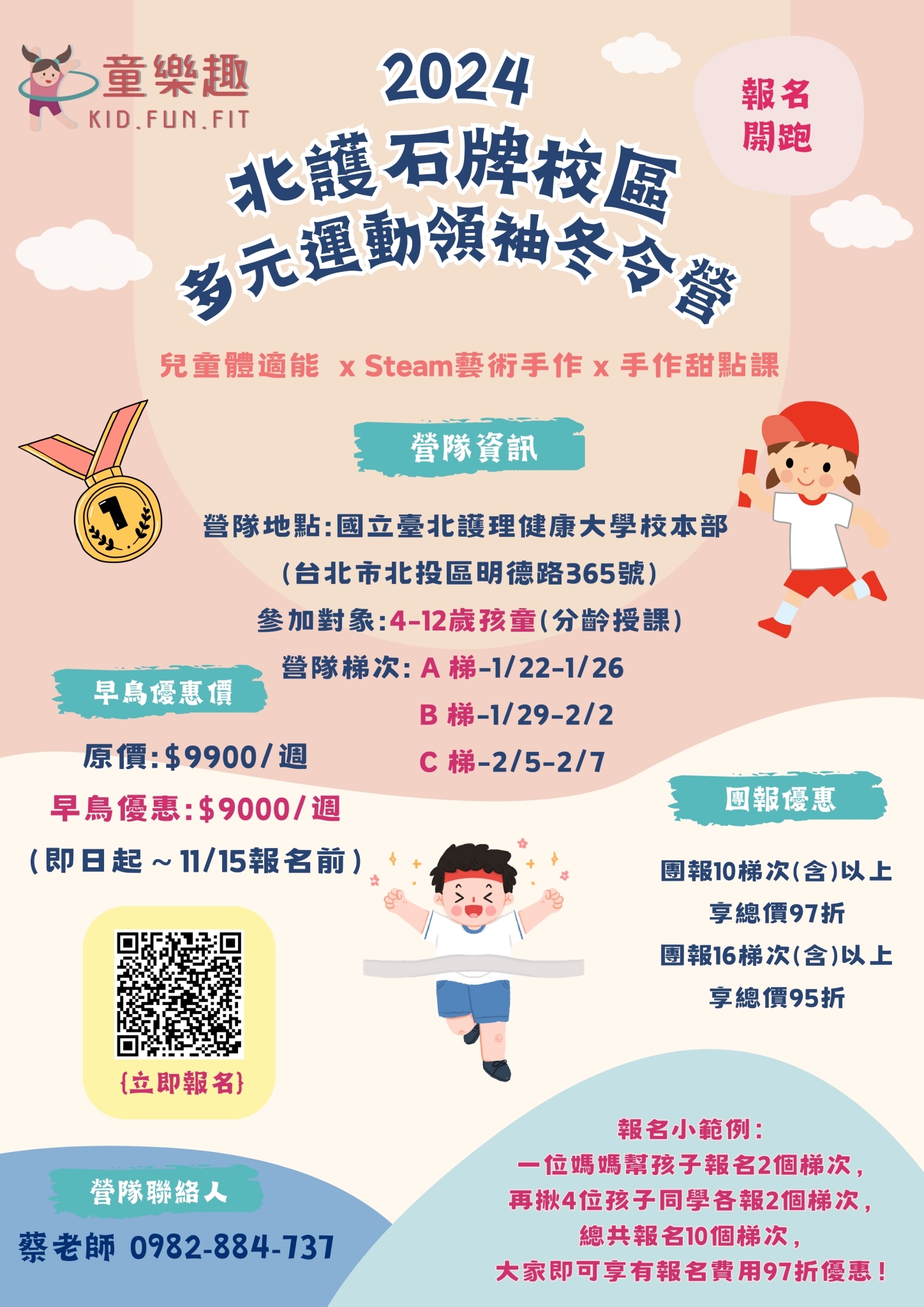 一、國立臺北護理健康大學推廣教育中心與童博健康管理工作室合作開辦「2024多元運動領袖冬令營」即日起受理報名。