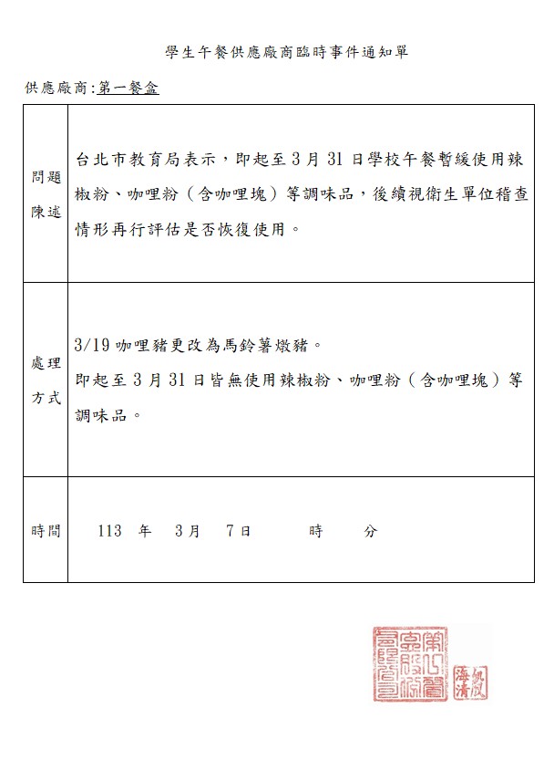 廠商接獲臺北市教育局表示,即起至3月31日學校營養午餐暫緩使用辣椒粉、咖哩粉(含咖哩塊)等調味品,後續再行評估是否恢復使用。
