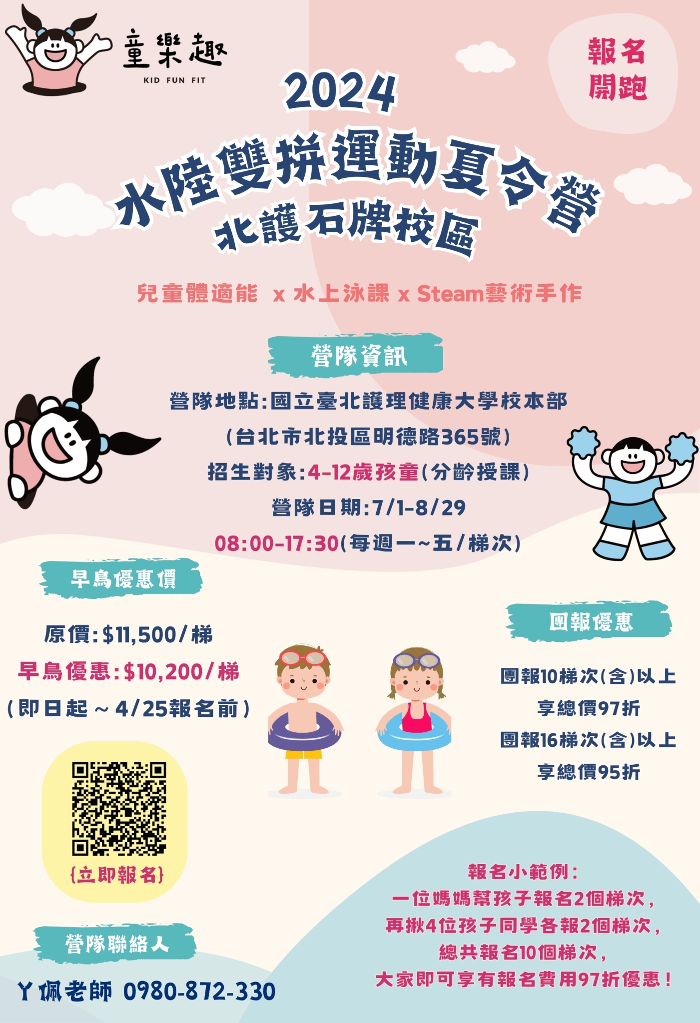 一、國立臺北護理健康大學推廣教育中心與童博健康管理工作室合作開辦「2024水陸雙拼運動夏令營」即日起受理報名。