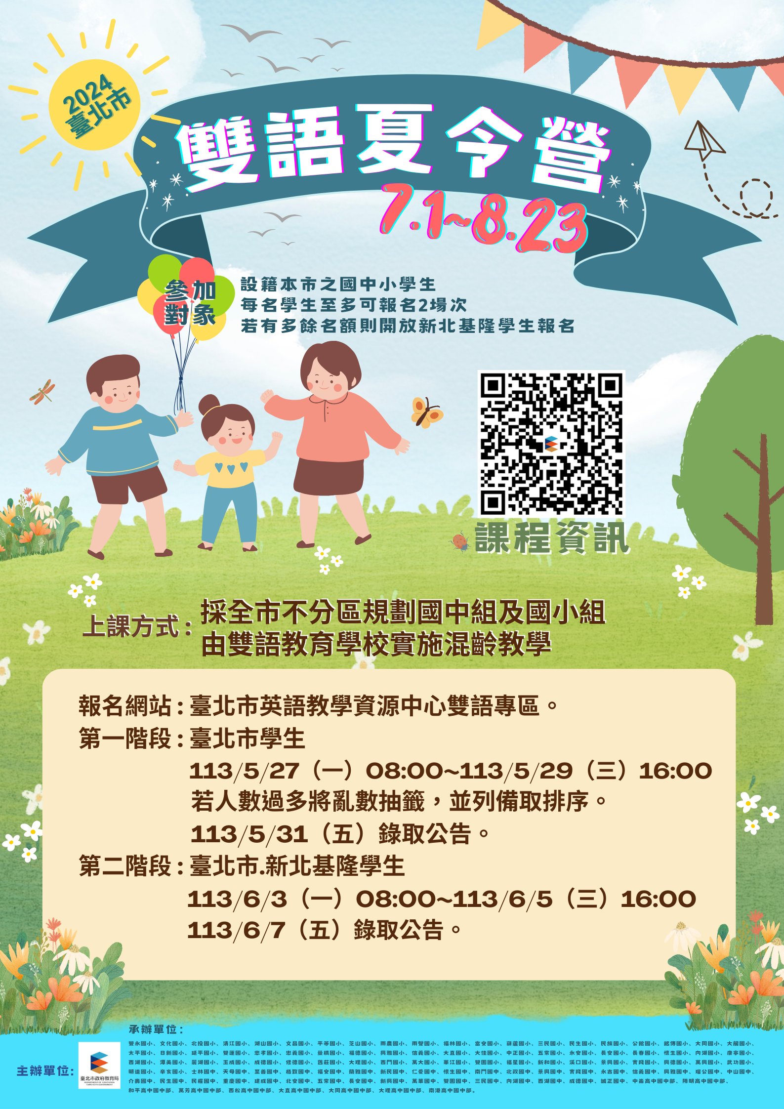 5、113年5月27日(星期一)上午8時起在臺北市英語教學資源中心雙語專區(https://ecamp.tp.edu. tw/bilingual/index.php)開放網路線上報名。