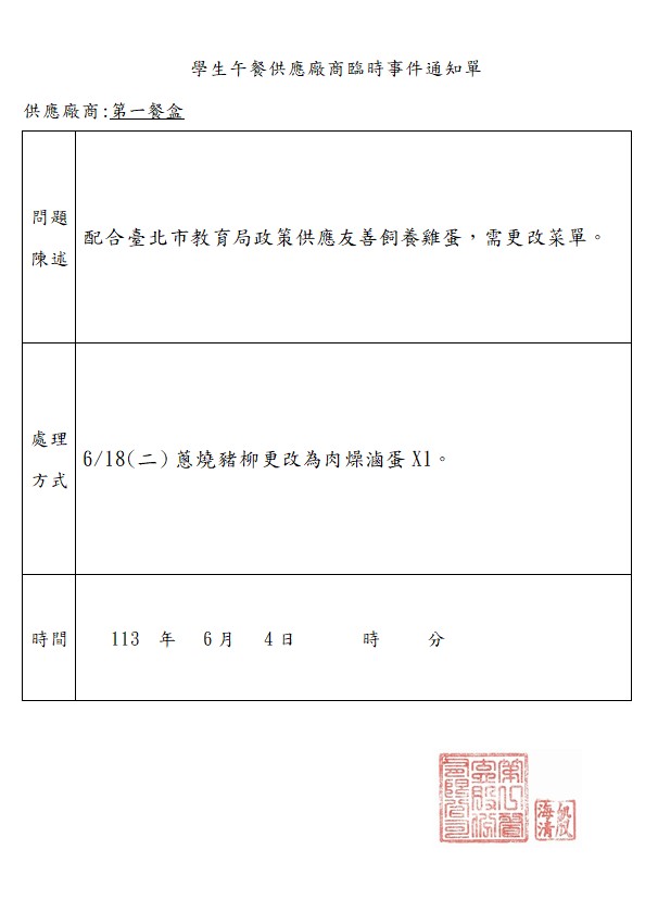 配合臺北市教育局政策供應友善飼養雞蛋,故更改菜單。