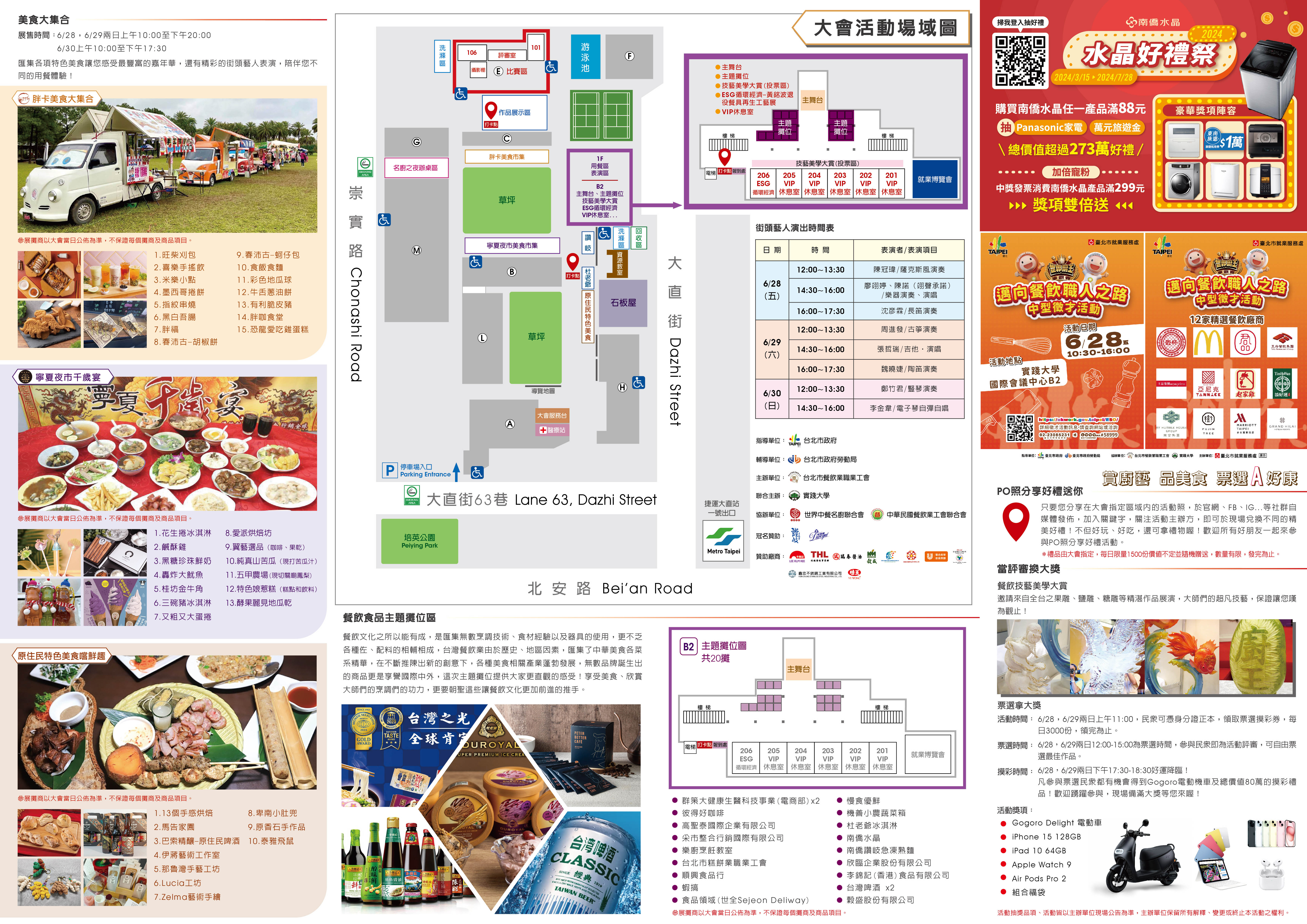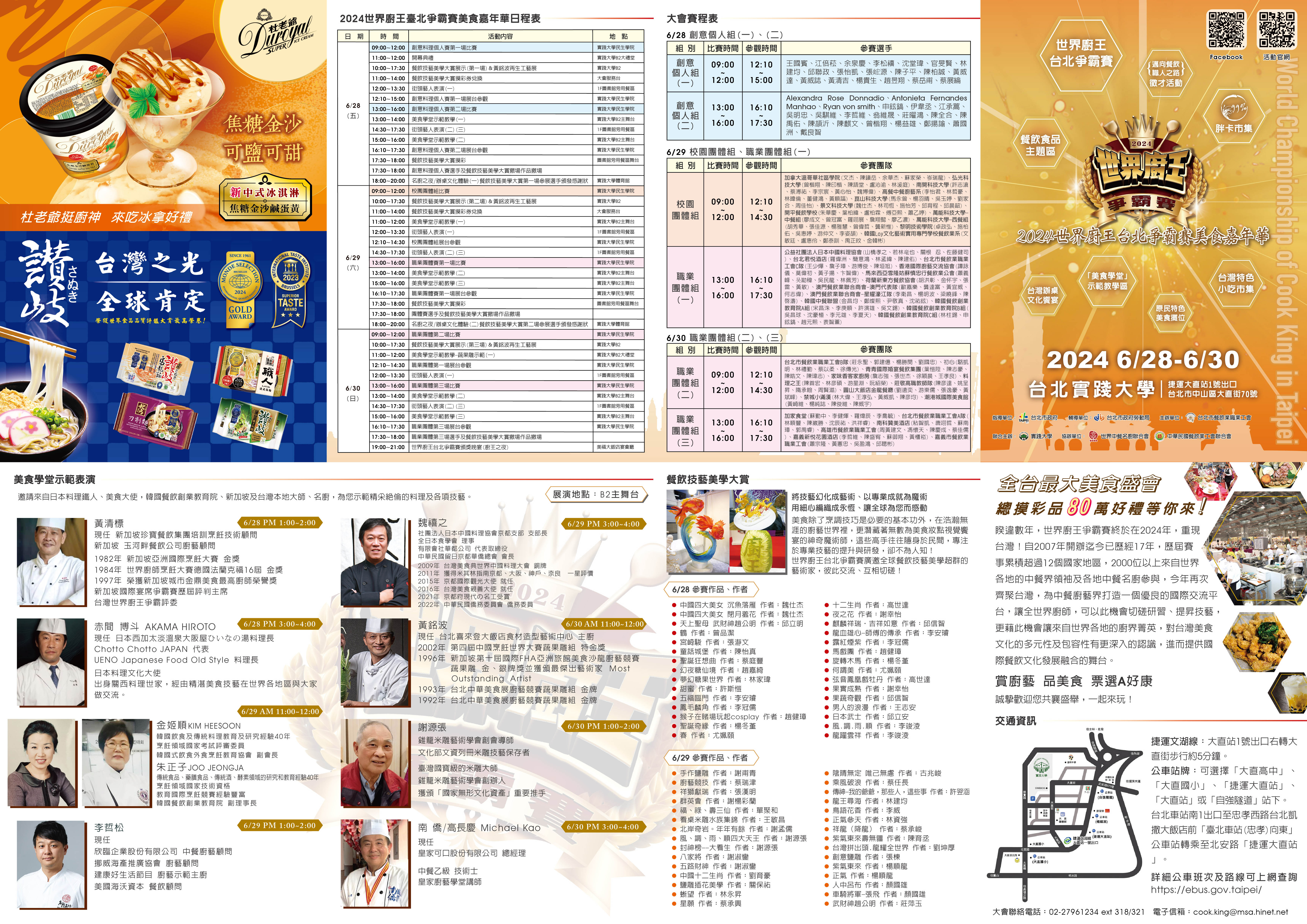 一、為提升勞動者職業技能拓展國際視野,臺北市餐飲業職業工會辦理「2024世界廚王爭霸賽暨美食嘉年華」,該活動訂於113年6月28日至6月30日假實踐大學辦理。